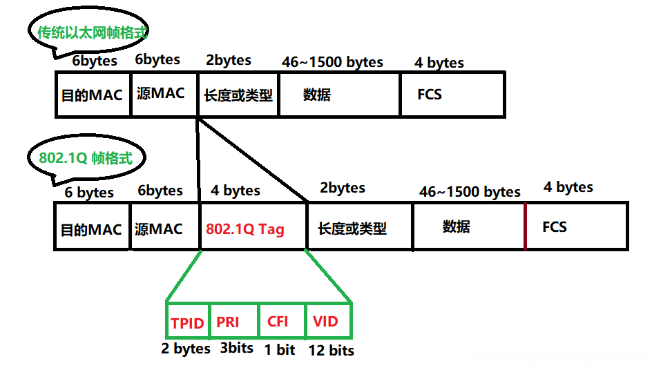 | TPID | 2 bytes | TagProtocol ID,表示这个帧是否带有Tag | 如果TPID取值为0x8100,则表示该帧是带Tag的帧;否则表示该帧是传统帧,不带Tag的帧,该字段与传统以太网中该位置的Type/Length字段是兼容的 |