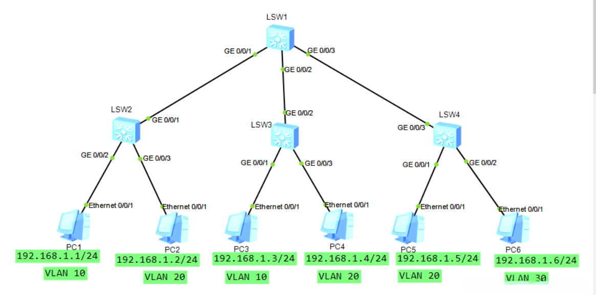 实验目的:为不同子网中的终端设备提供独立的安全环境并实现相互之间的通信连接。具体而言,在该网络架构中要求将终端设备根据所属的安全域编号分别归入VLAN 10(包含PC1和PC3)、VLAN 20(包含PC2、PC4和PC5)以及VLAN 30(仅包含PC6)。通过这种划分策略可确保同一安全域内的所有终端设备能够正常进行数据互通与资源共享。