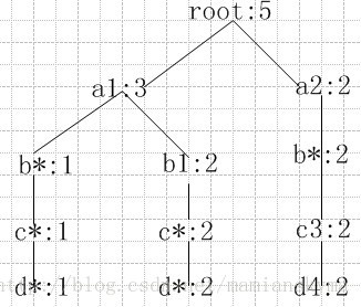 * 基本方体ABCD的方体树如上图所示。树的每一层代表一个维,而每个结点代表一个属性值。一条从根到树叶结点的路径代表一个元组。例如,树中结点C2具有聚集(计数)值5,表示值(a1,b1,c2,*)有5个单元。这种表示合并了公共前缀,节省内存并允许聚集内部结点上的值。利用内部结点上的聚集值,可以进行基于节享维的剪枝。例如,AB的方体树可以用来对ABD的可能单元进行剪枝。