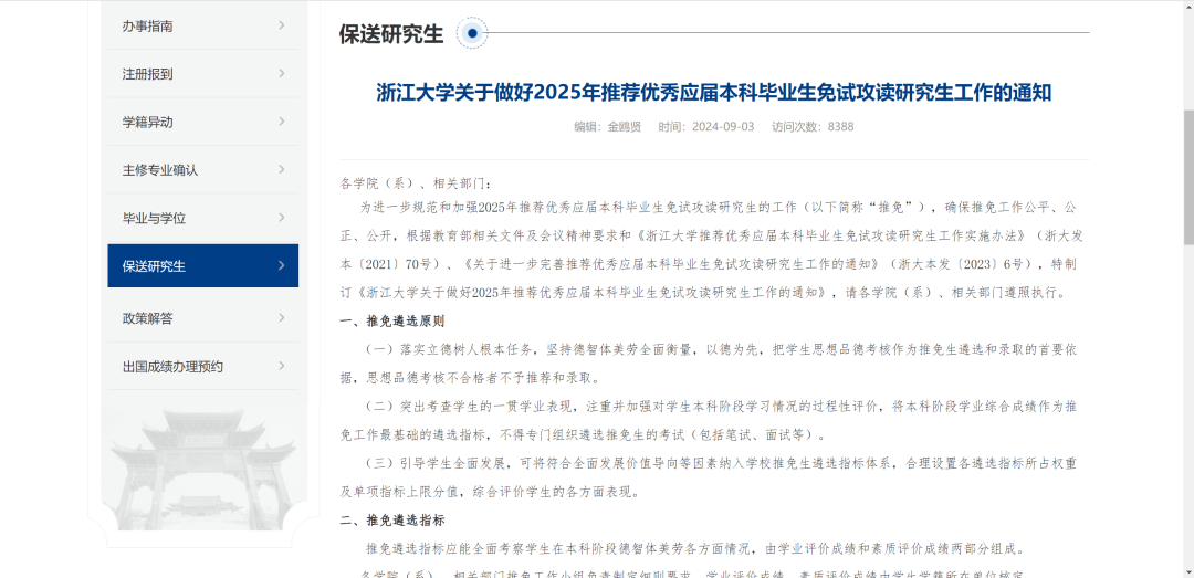2024年9月,浙江大学发布了关于做好2025年推荐优秀应届本科生免试攻读研究生工作的通知。