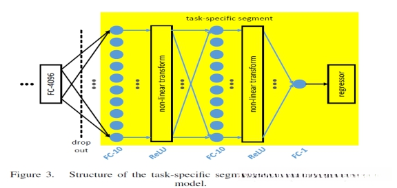 该系统采用AlexNet网络架构,并结合微调技术实现图像特征的精准获取。随后将特定任务模块连接于其上完成预测分数的学习训练过程。其中特定任务模块的具体网络结构如下: