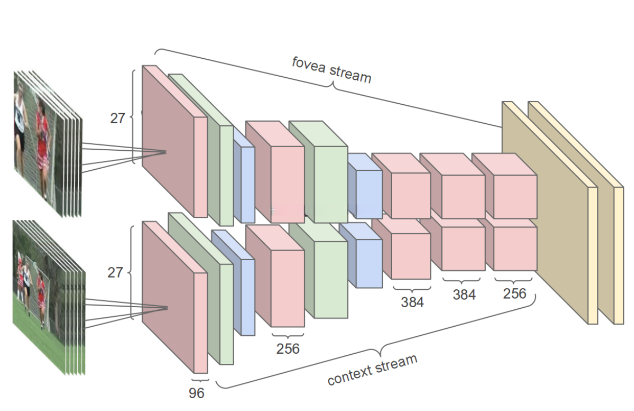 resolution CNN which composed by two separate streams. The context stream receives the downsampled frames at half the original spatial resolution (89 × 89 pixels), while the fovea stream receives the center 89 × 89 region at the original resolution. In this way, the the total input dimensionality is halved. Notably, this design takes advantage of the camera bias present in many online videos, since the object of interest often occupies the center regio he activations from both streams are concatenated and fed into the first fully connected layer with dense connections. See Fig.