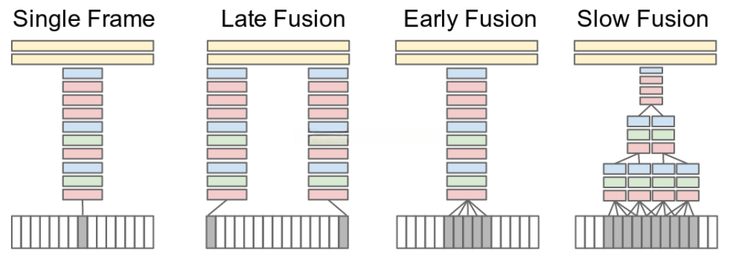 Late Fustion] Place two separate single-frame neworks with shared parameters a distance of 15 frames apart, and then merges the two streams in the first fully connected layer, which can compute global motion characteristics by comparing outputs of both networks.