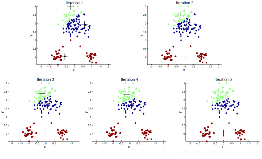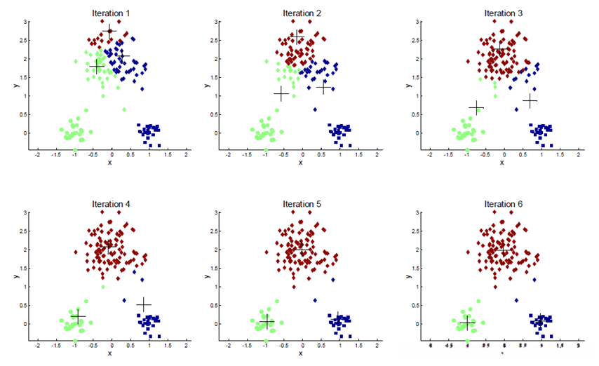 其核心思路在于最初随机选择k个样本作为簇心,并通过迭代过程逐步优化这些簇心的位置以实现数据聚类的目标。具体而言,在每一轮迭代中首先计算每个待分类样本与所有现有簇心之间的距离,并将其归入与其最近的簇心所属的类别中;接着重新确定每个簇类的新中心位置;并根据新确定的位置更新各簇心坐标值,并重复以上步骤直至算法收敛为止。