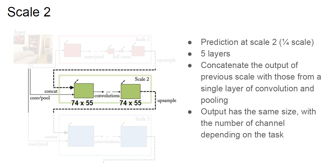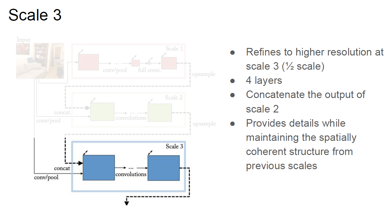 我们的模型最后一个尺度通过提升预测图片的整体分辨率并将其结果进一步细化。相比之下,在经过第二阶段处理后与原始图像提取出其卷积和池化特征的基础上,scale3生成了更为精细的画面视角。