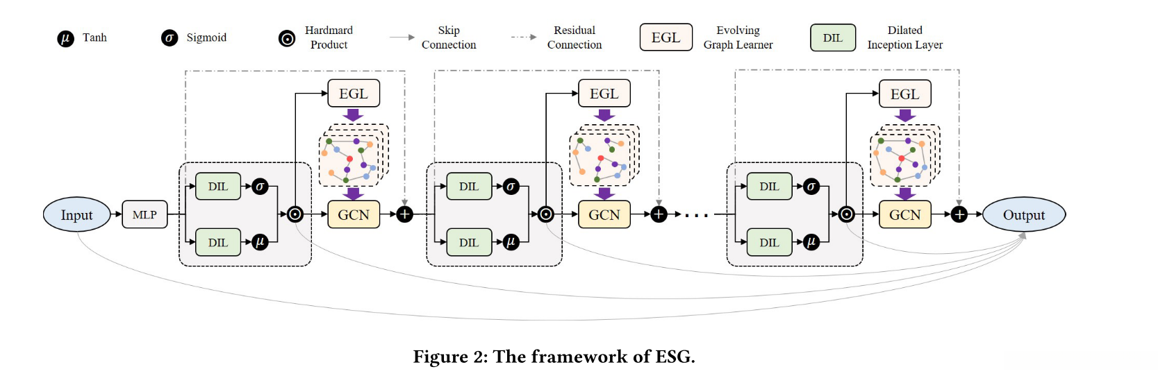 一种名为进化多尺度图神经网络(ESG)的框架。具体来说,提出了一种分层架构,与扩张的卷积模块配合,同时捕获特定尺度的时间序列间和内相关性。其次,对每个尺度构建一系列邻接矩阵来建模门控循环单元的演化相关性,而不是始终保持一个固定的图结构。最后,通过融合多尺度表示的统一预测模型进行最终预测。
