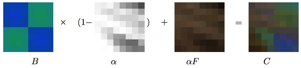 该运算符借助(乘以)因子(1−α)降低了对背景图像的影响程度,并引入了与前景图像相关的彩色参数及其透明度信息