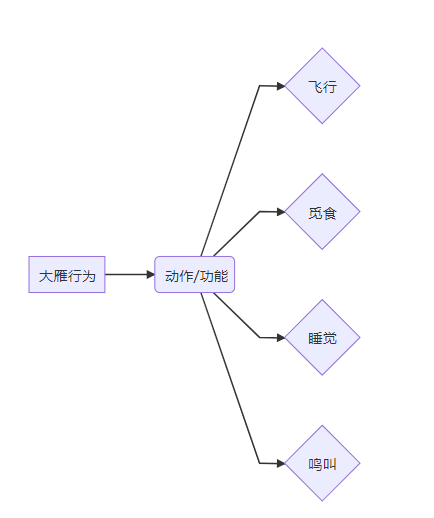 从这两张流程图中可以看出,在大雁群中所有的大雁都具有统一的外观特征和行为模式(功能),因此,在这种分类体系下,我们可以将这类生物统称为该分类中的成员或实例。
