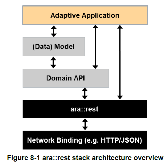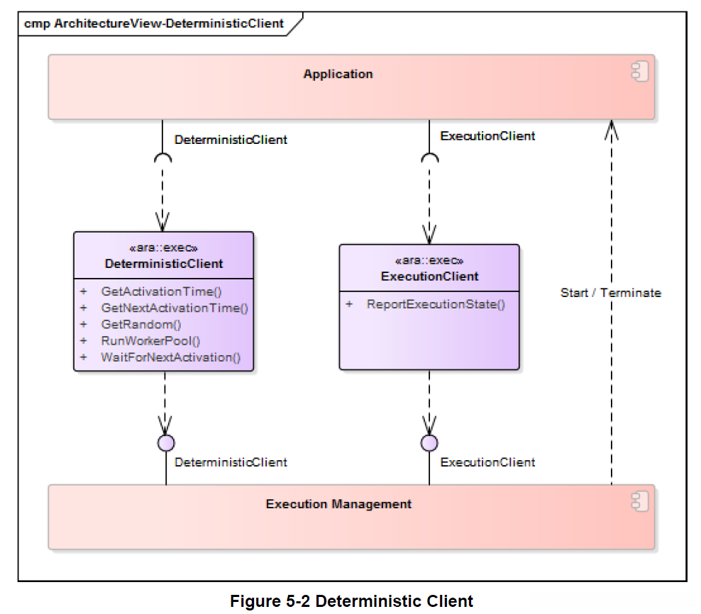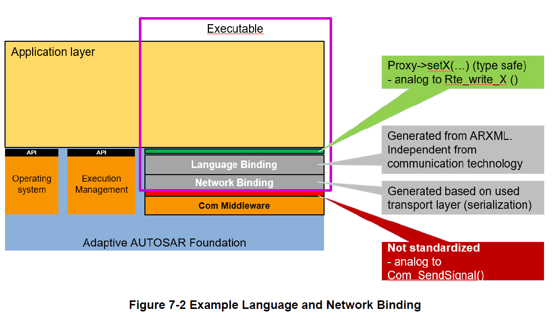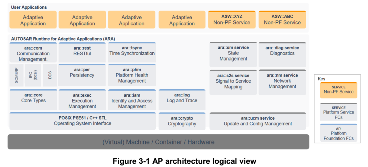 从应用程序的角度看, 这些功能接口在本质上没有区别, 无论这些功能来自 Adaptive Platform Foundation 还是 Adaptive Platform Service. 仅提供 C++ API 或者未来 AP 可能会支持的其他语言 interface. 这两部分内部实现必然存在差异, 并且在 ARuntime API (ARA) 库中可以使用除 Ara 以外的语言或 interface 来实现 AP 规范, 这取决于 AP 实现的具体方式