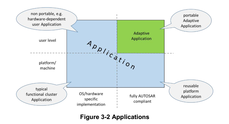 展示了AP系统的整体架构设计。其中一些功能源自于Adaptive平台基础组件和服务,并通过AUTOSAR运行时整合了各类功能组件的接口。任何自适应应用都可以向其他自适应应用提供服务。