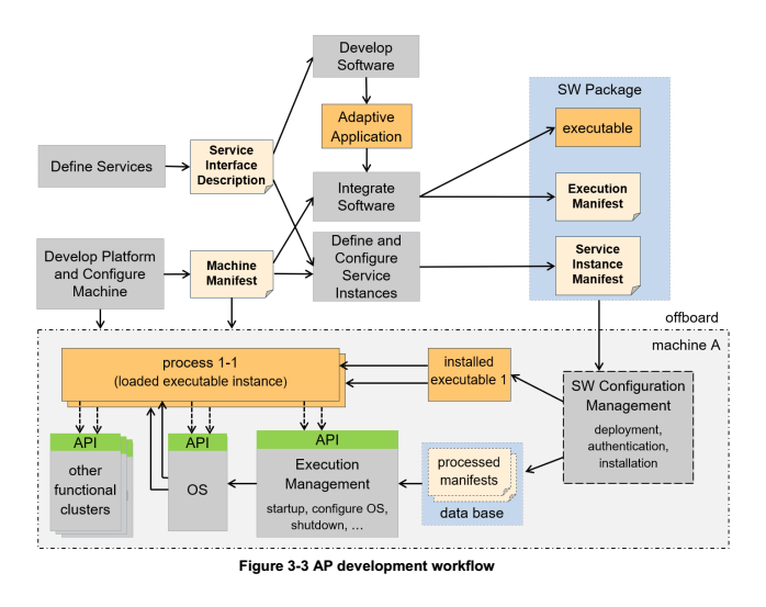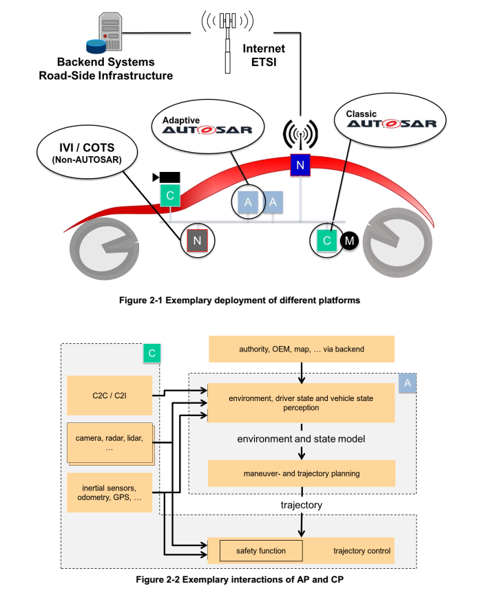 传统上采用AUTOSAR架构来满足嵌入式ECU的需求;然而这一架构却无法满足上述所提到的需求。为此,在此基础上开发出了自适应AUTOSAR(AP)平台;该平台具备高性能计算能力和可靠的通信机制;此外还支持灵活的软件配置方案;针对CP设计的独特特性(如接入电信号与汽车专用总线系统),这些特性可以通过模块化的方式集成到AP中进行扩展应用)。