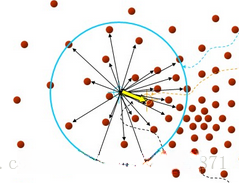 先算出当前点的偏移均值,移动该点到其偏移均值,然后以此为新的起始点,继续移动,直到满足一定的条件结束。结合上图,算法实施过程为:原点是选定的初始迭代点,将蓝色圆(其半径记为h)内所有向量相加,相加的结果如黄色向量所示,其终点指向上图所示的红色点,则下一次迭代以该红色点为圆心,h为半径画圆,然后求这个圆内以圆心为起点所有向量的和。如此迭代下去,圆的中心点为收敛于一个固定的点,也就是概率密度最大的地方。所以 均值漂移算法本质上是一种基于梯度的优化算法。