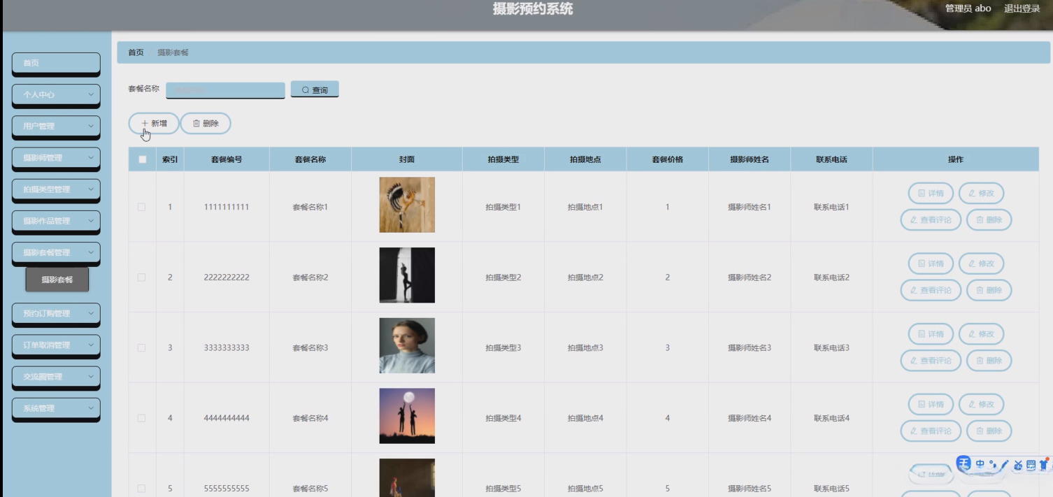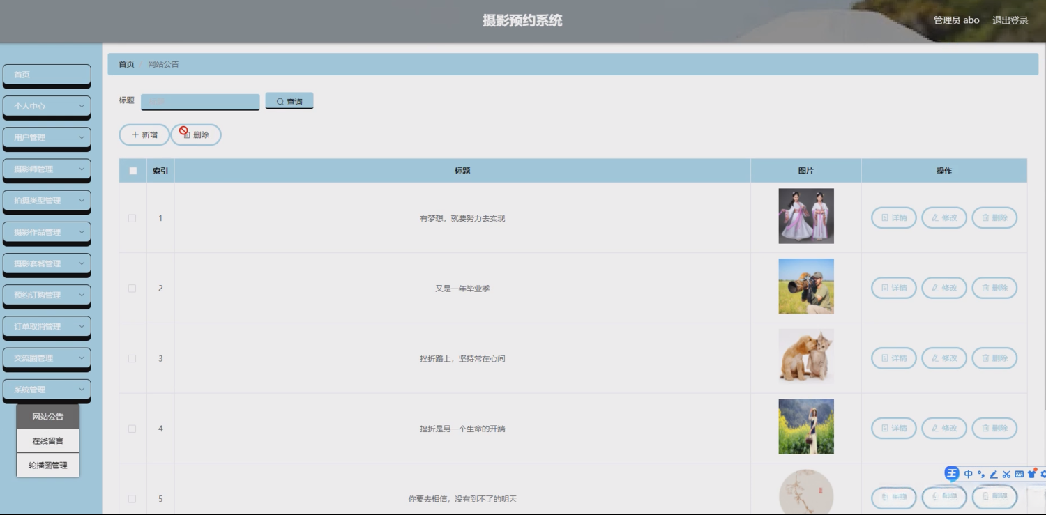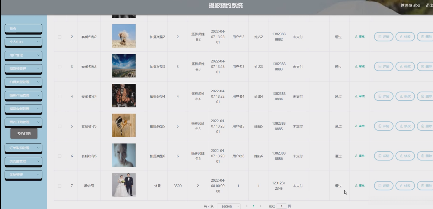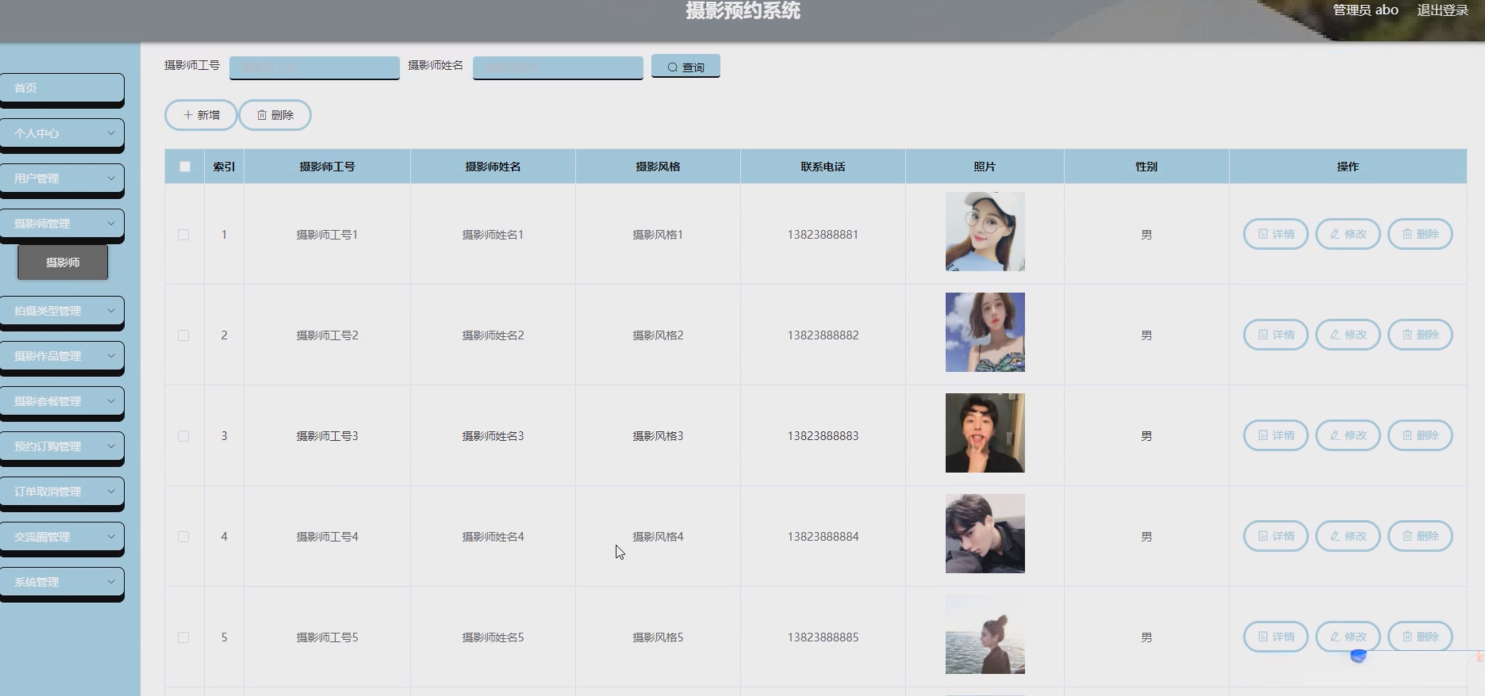 - 后台管理系统 :方便管理员进行用户管理、摄影师管理和订单管理等操作。