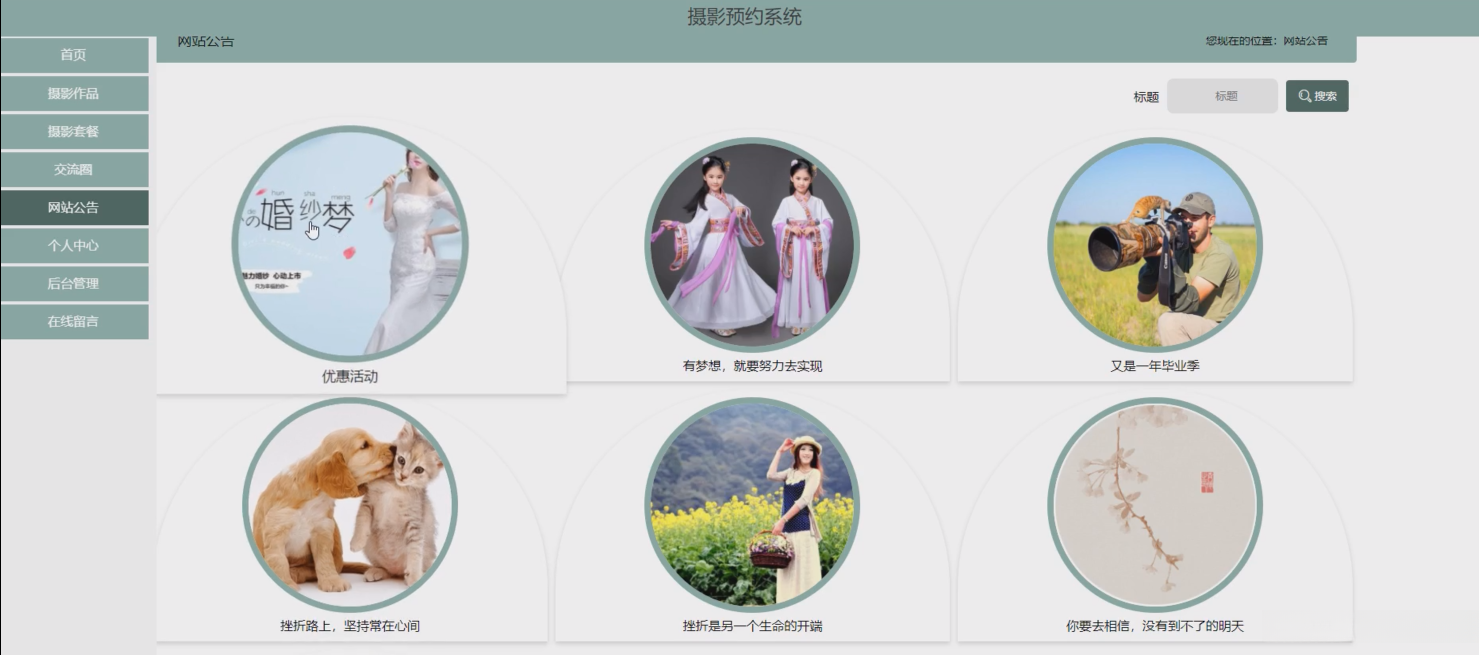 - 预约管理 :实现在线预约、查询、取消等功能,提供摄影地点的选择和展示。