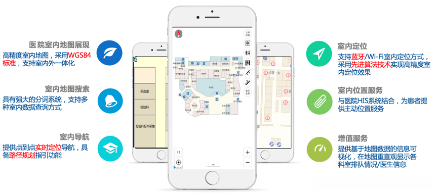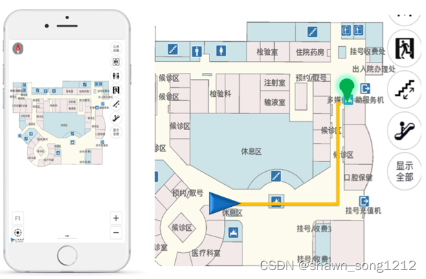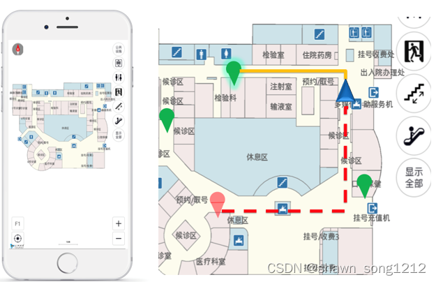智能寻路:根据所输入科室位置和用户位置,自动建立最快路径;