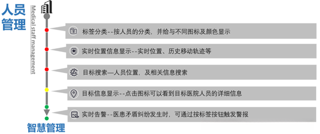 同样可利用电子标签实现对特殊病人的精细化管理。该系统通过按人员类别进行分组,在每个组别中为不同类别病人定制独特的标识符号,并赋予其相应的颜色标记等级。每个病人都会佩戴独一无二的电子标签标识,在医院范围内可实时追踪他们的移动轨迹。当医护人员需要查找特定患者时,在后台系统中即可快速定位并查看其位置信息