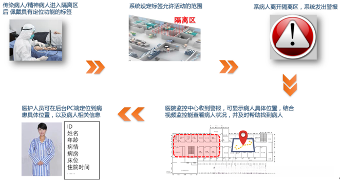 对于一些具有特殊病情的精神病人及传染病患者,医院可设立电子围栏区域。一旦某病患的位置信息不在指定区域范围内,后台系统会立即通知管理人员。医护人员能随时查看病人的实时位置信息,并通过监控录像资料等信息快速定位到患者位置,从而有效防止可能危害其他人员健康的状况发生。