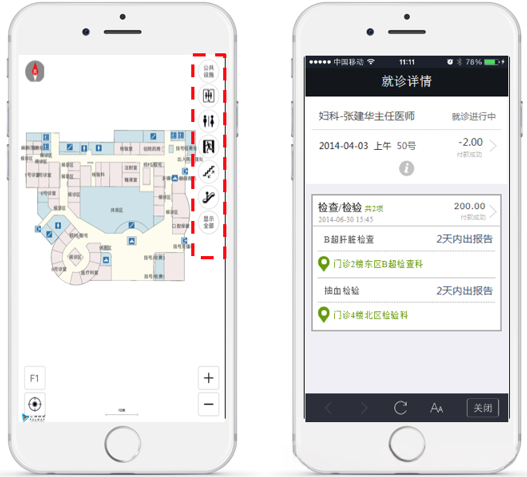 借助院方HIS系统的整合,在微信上完成挂号后,则能够提供主动式的定位服务。系统将实时获取患者的信息,在地图中帮助规划最便捷的路线,并告知患者前往指定科室的具体路线。