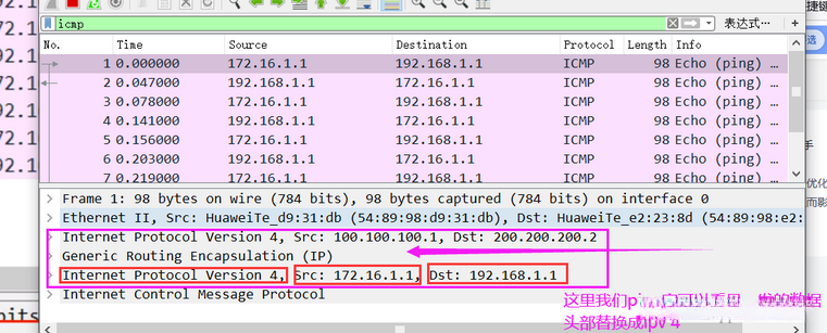 这个的原理跟同vlan间通信是一个道理,不过他是进入加上ipv 4的头部,出去的时候剥离,