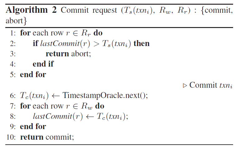 基于算法1, 一个事务将在与其他事务无并发修改的情况下被提交至系统.为体现该特性, 在算法2中, 该事务将向状态Oracle提交一个空的读集.由此可见, 当读集与写集皆为空时, 状态Oracle将不会执行任何计算.