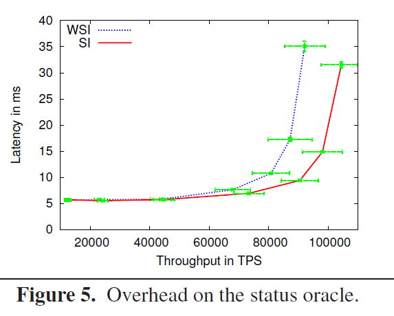如图5所示,在正常负载条件下,写快照隔离与快照隔离之间的性能差异几乎可以忽略不计。在该场景下运行时,在写快照隔离模式下达到80K TPS的速度(即每秒传输80千兆数据),此时系统的平均延迟为10.7毫秒(ms)。随后吞吐量略微增加但伴随显著提升的延迟值表明系统存在瓶颈现象:这是因为状态oracle组件内部产生了缓冲延迟。而更为关键的是,在当前状态下运行时的核心逻辑执行冲突检测机制导致的状态oracle最终采用write snapshot isolation模式能够更快地达到饱和效果。