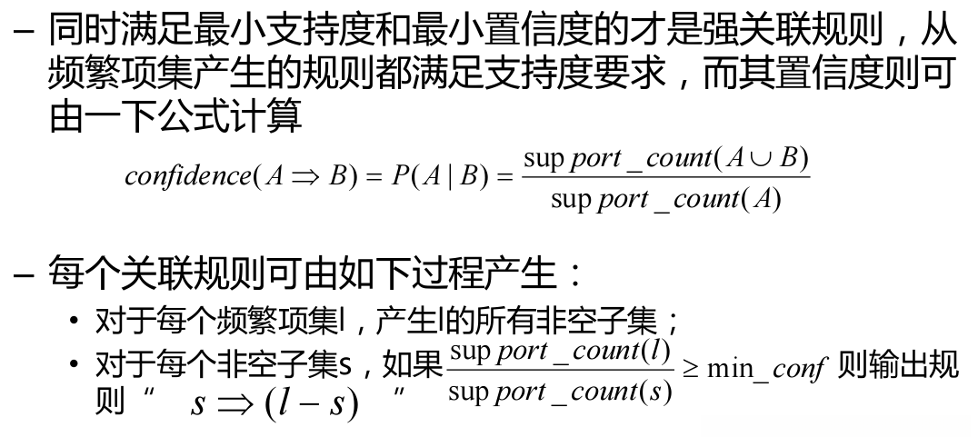 给定一个频繁项集L,请确定其每一个真子集f是否满足f\rightarrow L-f的支持度不低于设定的最小支持度。
