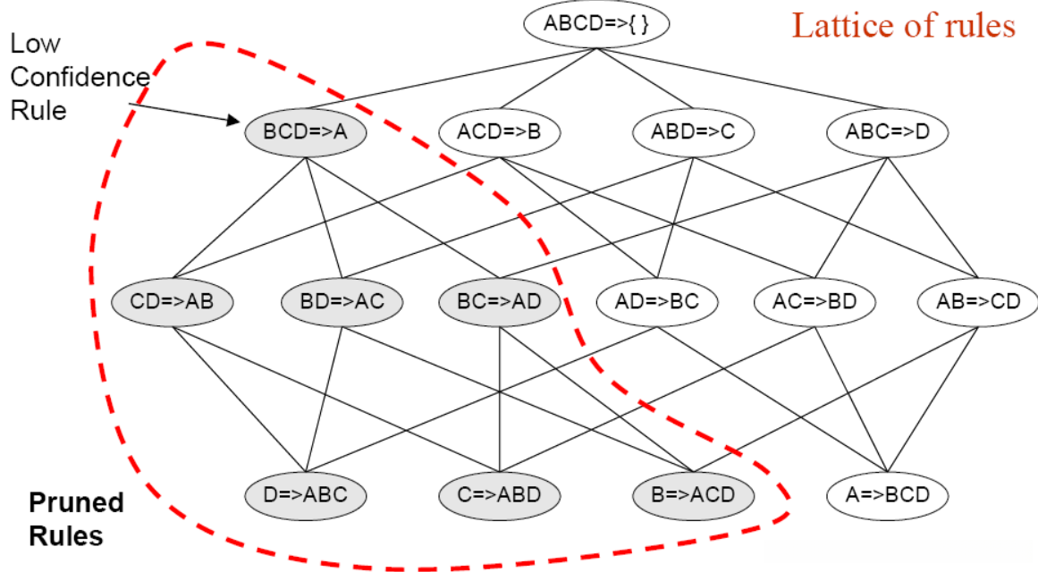 – 若子集AD→BC的置信度低于设定最小阈值,则舍弃D→ABC