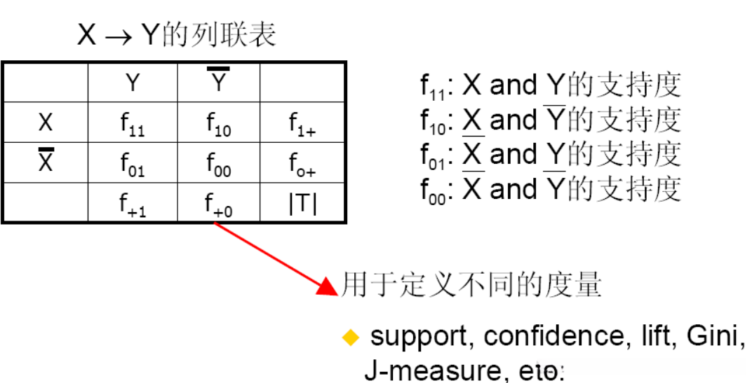 – 基于给定的规则关系X→Y,评估关联强度的相关信息完全可依据列联表进行获取,并且该信息的形式即为... (contingency table)