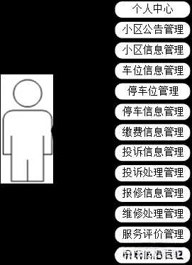 业主用例图根据物业管理的需求进行分析,包括个人中心、小区公告管理、小区信息管理、车位信息管理、停车位管理、停车信息管理、缴费信息管理、投诉信息管理、投诉处理管理、报修信息管理、维修处理管理、服务评价管理、活动信息管理等。业主用例图如下所示: