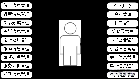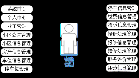 课题主要分为四大模块:即管理员模块,物业管理模块、业主模块和维修员模块,主要功能包括:个人中心、物业管理、业主管理、维修员管理、小区公告管理、小区信息管理、房产信息管理、车位信息管理、停车位管理、停车信息管理、缴费信息管理、投诉分类管理、投诉信息管理、投诉处理管理、报修信息管理、维修处理管理、服务评价管理、活动信息管理等。