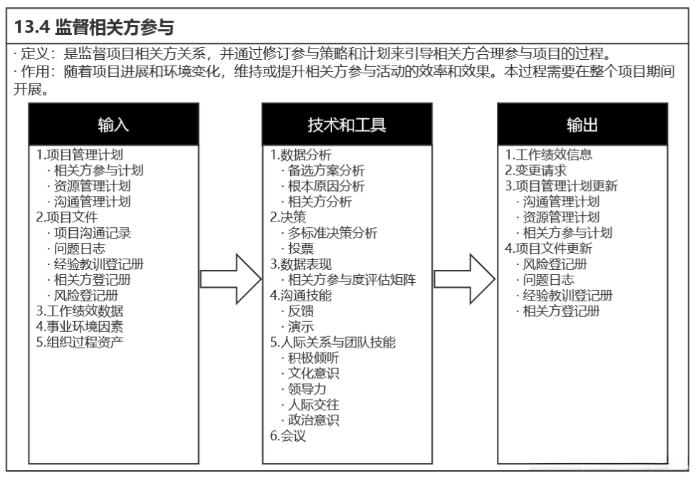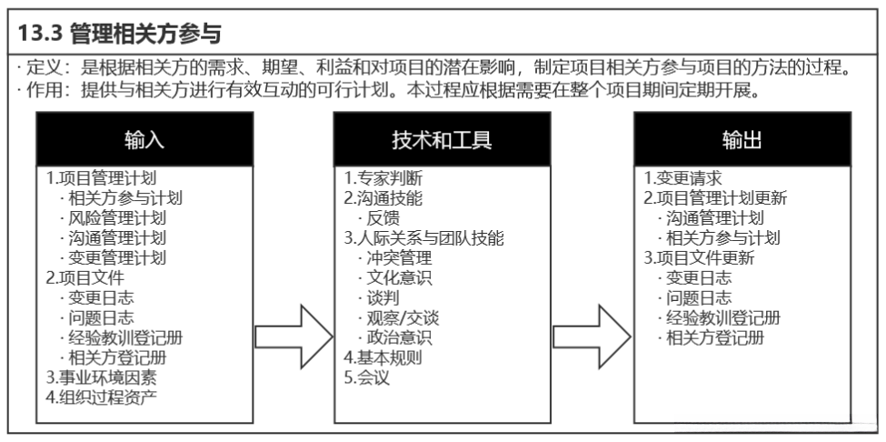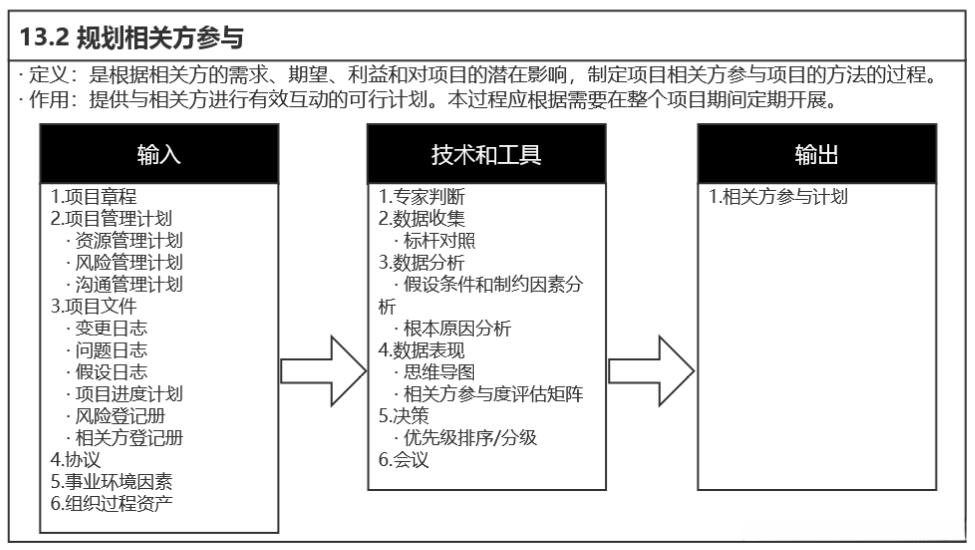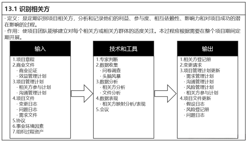 识别能够影响项目或会受项目影响的人员、团体或组织,分析相关方对项目的期望和影响,制定合适的管理策略来有效调动相关方参与项目决策和执行。
