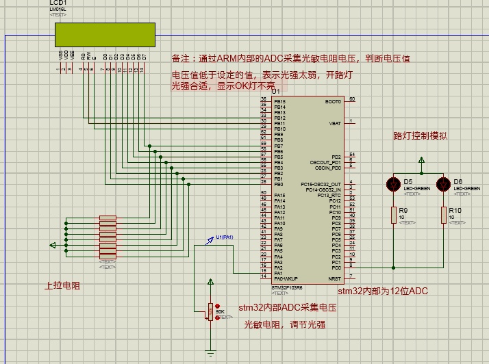 备注:通过ARM内部的ADC采集光敏电阻电压,判断电压值