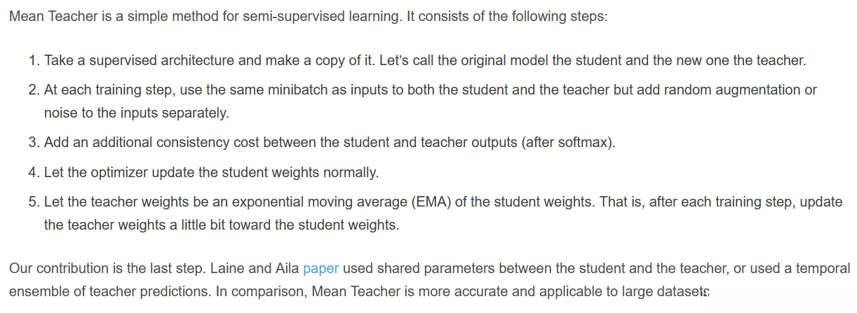 Mean Teacher :一个网络复制两份,一份作为student model,另一份是teacher model,使用student中间层的参数,EMA加权更新teacher的weight