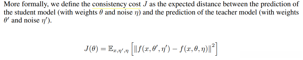 Temporal Ensembling :1 无标签数据经过网络得到的结果 2 同一组数据各个epoch的 预测结果 EMA加权得到的总的预测结果 二者预测结果的square difference作为loss的一部分加到总损失中进行梯度下降