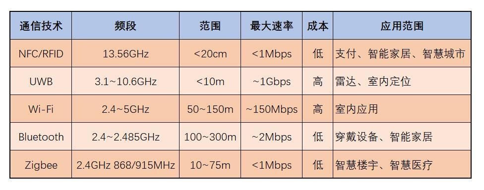NFC/RFID :低功耗,但距离非常短。用于支付,物流仓储等场景。