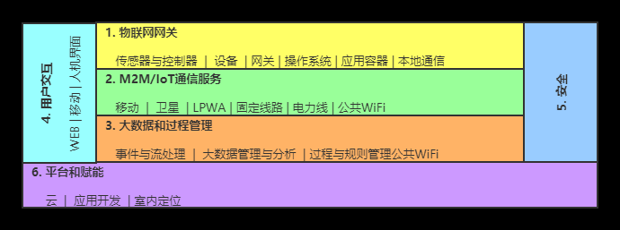 和传统企业应用于互联网应用相比,物联网的技术栈更宽泛更复杂。大致可以将物联网归类为以下 6 组技术栈:
