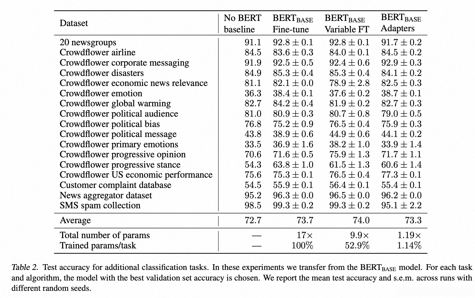 实验结果表明,Adapter tuning 表现出了与 full fine-tuning 相似的性能,并且减少了训练参数的数量。