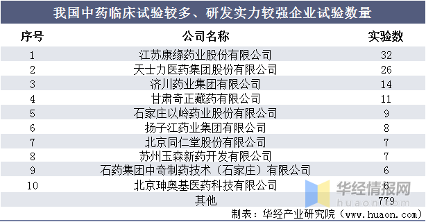 我国中药临床试验较多、研发实力较强企业试验数量