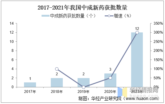 据数据显示,我国中药新药制剂从2016至2021年间总计获批20种,在这其中的年度数据显示:其中,在2021年这一关键年度有12种新药制剂获得批准;相较于上一统计周期(即与2020年的数据相比),该数量增加了9种;值得注意的是,在这一增长过程中(即比较时间段内),其数量已超越此前两年间(即指过去四个统计周期内的总量)
