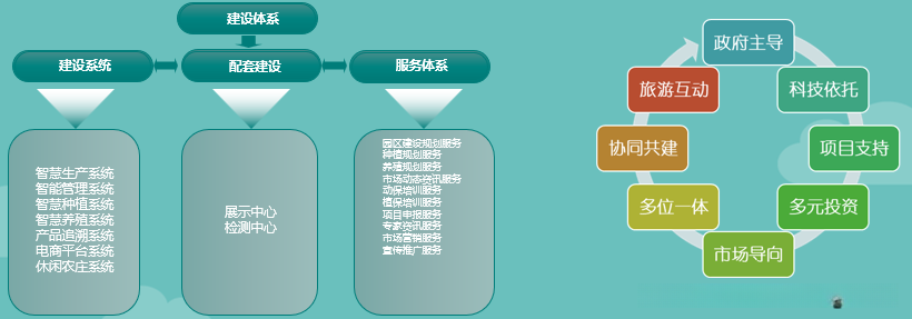 充分利用和发挥当地独特的自然资源优势,以政府为主导、以科技为依托、市场为导向、多位一体、多元合作,打造生产示范、休闲观光、现代农牧业产业融合、物流信息公共服务平台为一体的区域特色农业示范基地,国家一流的工厂化农业示范园区,实现种植加工产业的结构调整,带动区域农业及生态旅游业的发展。形成一个集旅游观光 、农业高效 、优化生态环境和社会文化功能 为一体的原生态农业旅游、休闲、娱乐新型智慧农业大园区 。