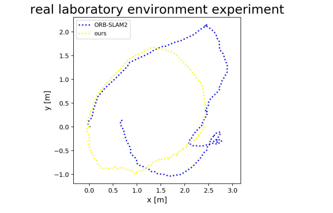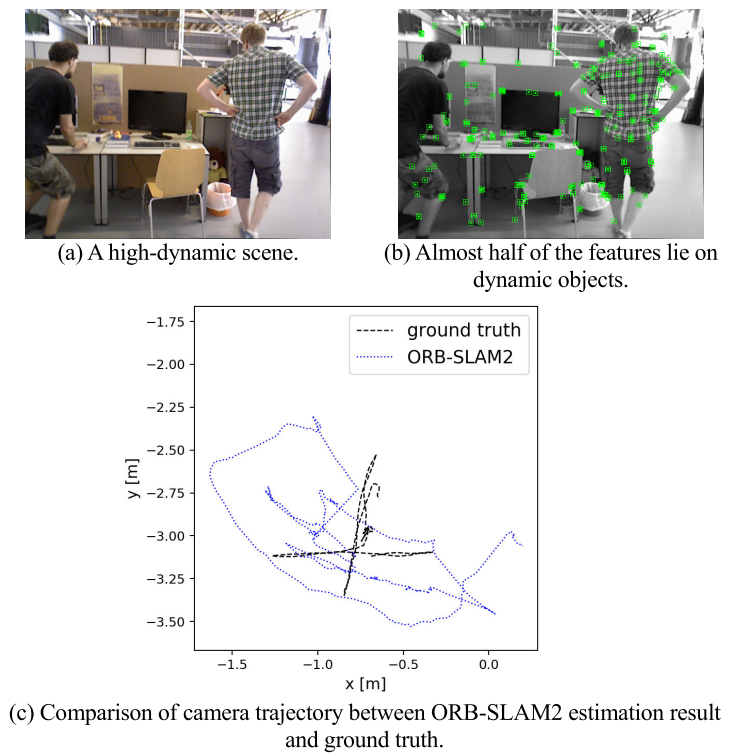 图1. 在高动态场景中,ORB-SLAM2估计的相机轨迹完全无法使用。
