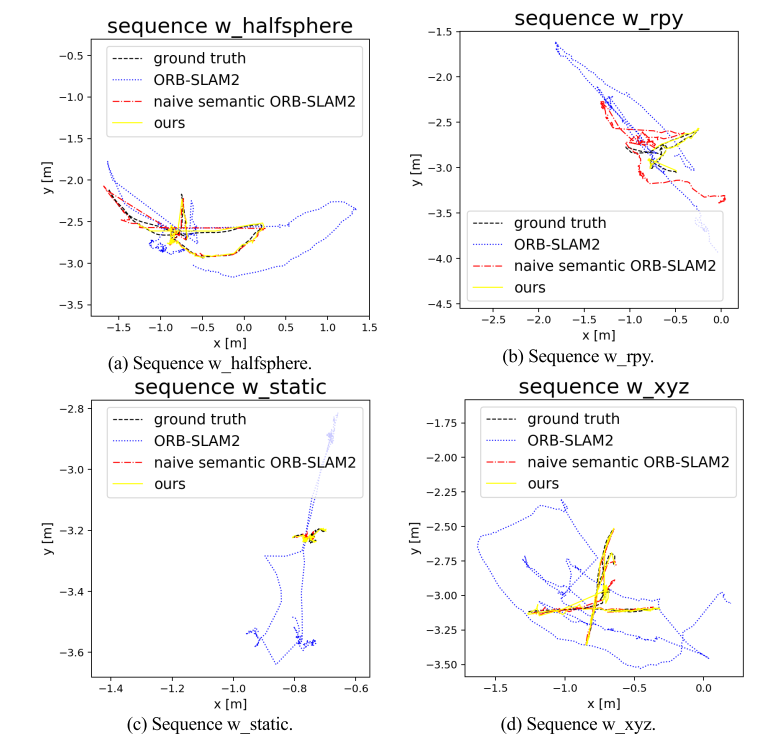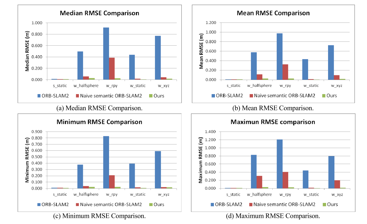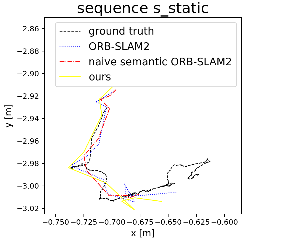 从表1的数据可以看出,在低动态序列s_static中,这三种方法的表现基本上是相同的。在高动态环境所代表的其余四个序列中,则无论采用我们的系统还是naive semantic ORB-SLAM2的方法,在准确性方面都较原始的ORB-SLAM2实现了显著提升。具体而言,在中值、平均值、最小值和最大值等指标上计算出的RMSE值明显降低了数量级。这是因为语义信息对于去除动态特征确实很有帮助。然而尽管如此但语义信息本身也具有一定的不确定性正如我们在第二节所述。在高动态条件下仍然存在一些难以有效去除的动力学特征。针对这些问题本文提出了一种基于语义光流的方法它能够充分结合并利用两者的潜在特性从而更加有效地去除了动力学特征因此我们系统的定位准确率达到了最高的水平