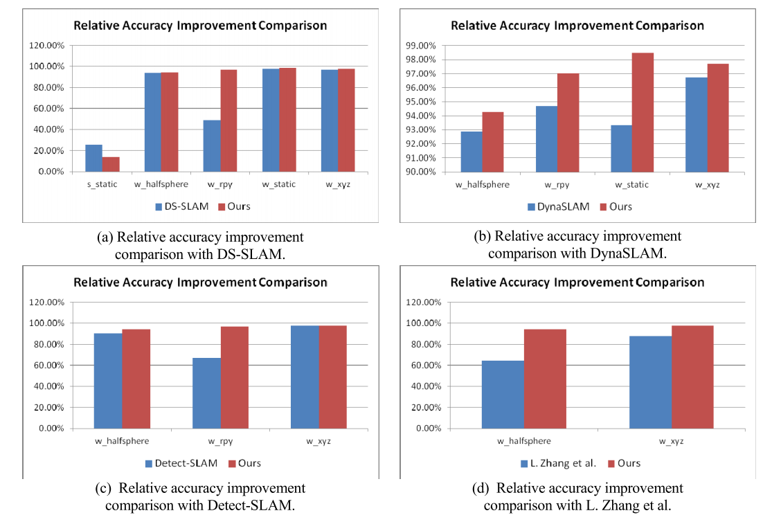 此外,在动态环境下与其他最先进的SLAM系统进行了对比实验,并基于原始论文中的评估指标进行了分析。我们选择将DS-SLAM [25]、DynaSLAM [26]、Detect-SLAM [21]以及Zhang等人[22]的系统与之对比。具体实验结果可见表3。通过对比分析发现,在动态环境中不同算法表现出不同的性能特征:我们的SOF-SLAM方法也采用基于ORB-SLAM2框架的设计思路,并通过相对RMSE减小比例作为关键评价指标来量化系统的性能提升效果(如图13所示)。具体而言,在低动态序列s_static中,我们的系统表现略低于DS-SLAM;但在其余四个高动态序列中则取得了更好的成绩。进一步分析表明,在低动态环境中动态特征较少且易于被消除这一特点使得特征保留能力更强从而提升了整体精度;而在高动态环境下由于特征更新频率更高可能导致部分特征被误判从而影响最终效果。综合来看,在四个高动态序列测试中我们的系统均表现出了显著的优势