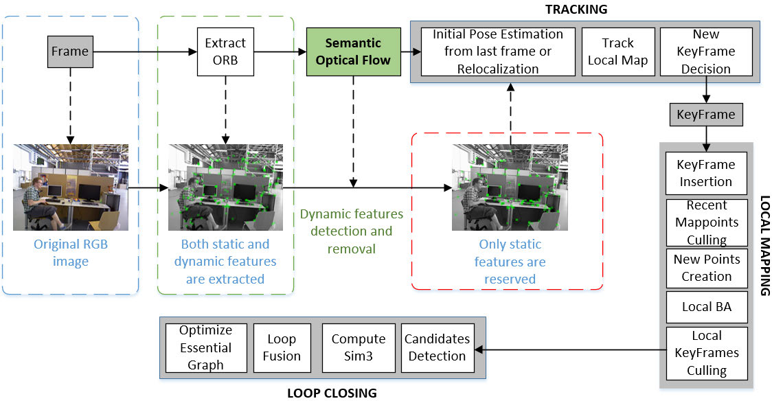 采用我们的动态特征检测与去除方法——语义光流——通过紧密关联的方式综合运用几何与语义信息来显著降低环境中动态物体的影响。