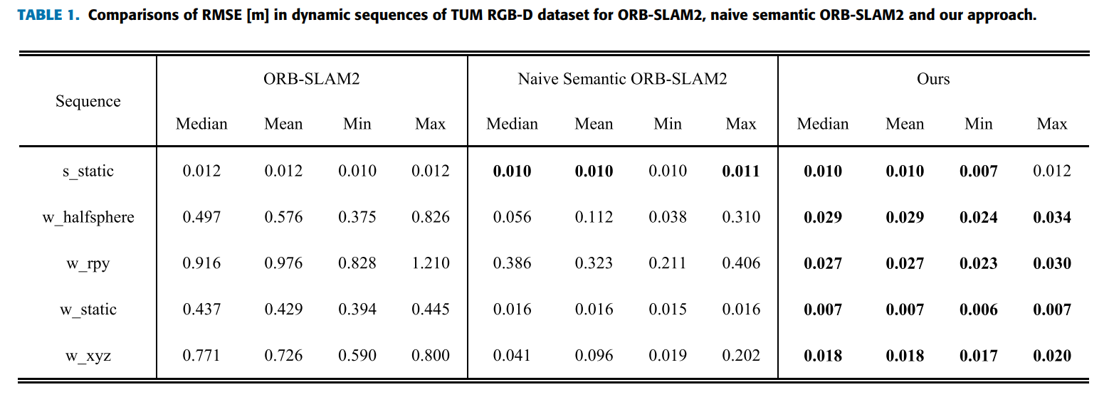 肖等人[24] 在独立线程中部署了SSD的目标检测网络以获得动态物体先验知识,并通过追踪线程中的选择性跟踪算法对动态物体上的特征进行处理以显著降低位姿估计误差。