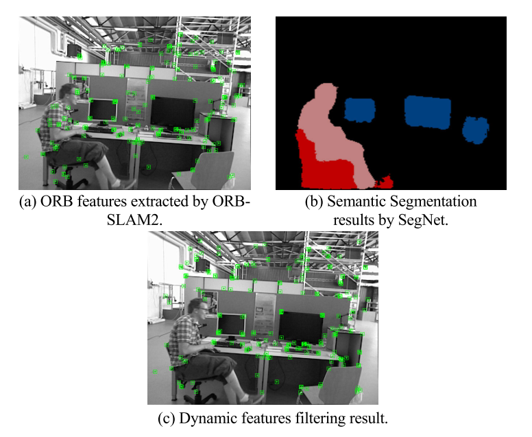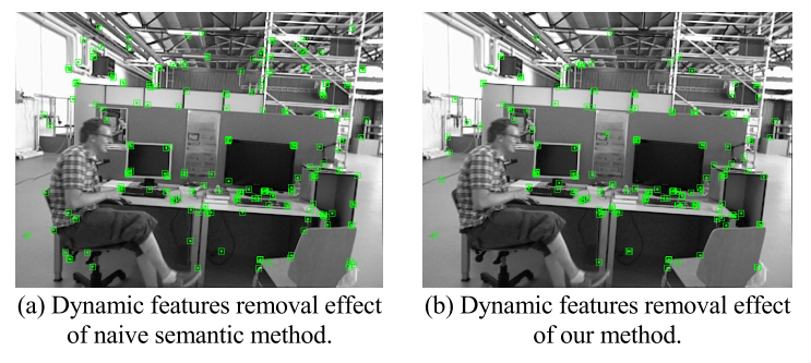 图5 通过简单地使用语义分割结果作为掩码来过滤动态ORB特征的示例