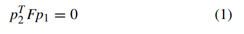 f 包含了9个未知量;然而由于基础矩阵F所具有的尺度自由特性的影响,在计算过程中其自由度可降低至8个。因此,在相邻帧之间对应了8对图像点的情况下,我们可以通过求解形式为(6)的一组方程来确定矩阵F。