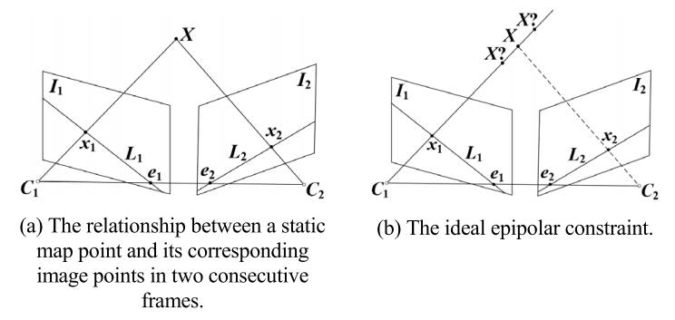 利用对极几何属性的几何约束可以用来检查特征是动态的还是静态的。静态特征应该满足多视图几何中的对极约束,而动态特征将违反标准的对极约束。图6(a)显示了在两个连续帧中对应图像点之间的关系。X是一个静态地图点,它在两个连续帧中被成像,x1在帧 I1 中,x2 在帧 I2 中。C1和C2分别是I1和I2相机的光学中心,连接C1和C2的线被称为基线。基线和地图点 X 确定了一个平面π,称为对极平面。平面π与图像平面 I1 和 I2 在线L1和L2上相交。L1和L2被称为对极线。基线与图像平面的交点被称为对极点,即图6中的e1和e2。假设我们只知道 I1 中的x1,我们想要找到它在I2中的对应点x2,如图6(b)所示。在没有深度信息的情况下,我们只知道地图点X位于从x1反向投影的射线上,因此我们只知道x2位于对极线L2上。这个几何约束实际上描述了从一个图像中的点到另一个图像中相应的对极线的映射,这个映射关系可以用基础矩阵F来描述: