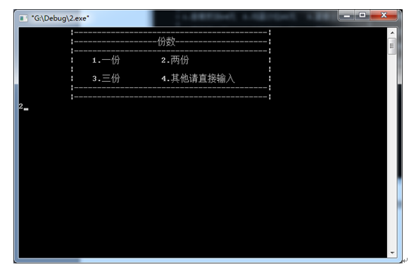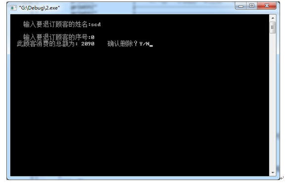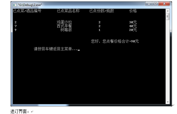 该程序在运行时的主要菜单及其相关功能模块包括:主菜单用于显示主界面对应的内容;输入框区域负责接收用户的输入信息;查询框区域提供数据查询功能;点餐模块对应具体的点菜操作;删除框区域支持对数据进行删除操作;退出按钮则用于结束整个程序的操作流程