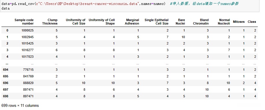 将data赋值为从r"C:\Users\HP\Desktop\breast-cancer-wisconsin.data"中读取的CSV文件,并指定columns参数为names。